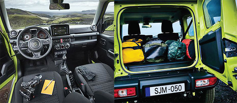 Di bagian interior, Suzuki Jimny terbaru memilih desain minimalis dengan warna hitam. Desainnya yang ngga neko-neko membuat tampilan Jimny terbaru malah tambah keren.